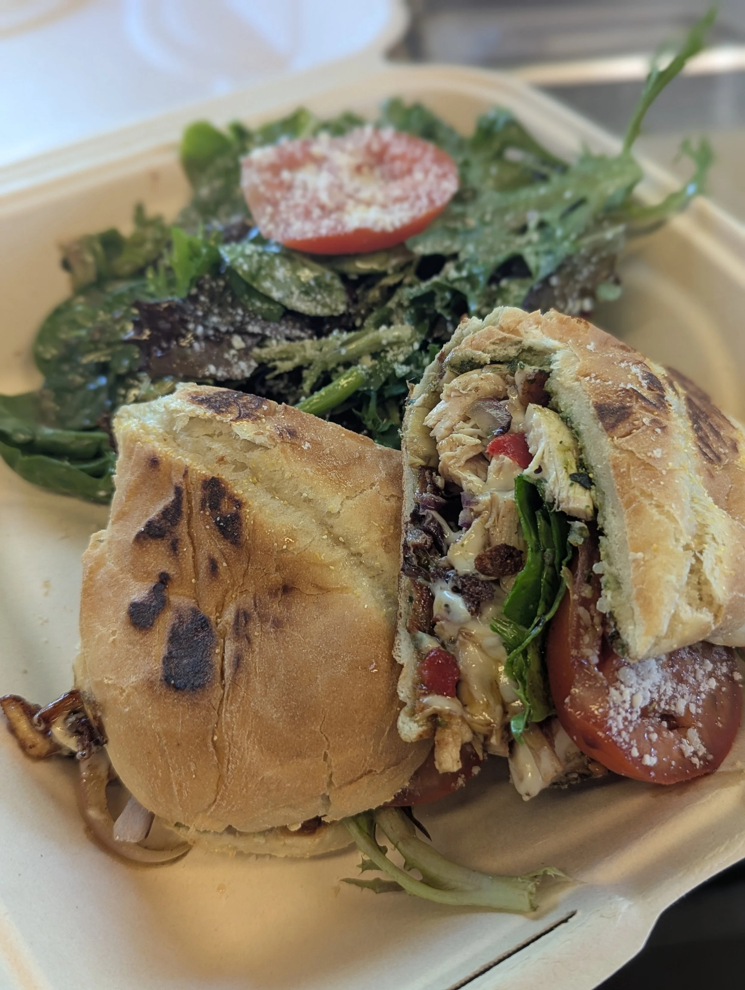 Pesto, Grilled chicken, Italian cheese, roasted red pepper, Artichoke hearts, red onion tomato and fresh greens drizzled with balsamic vinegar and oil.